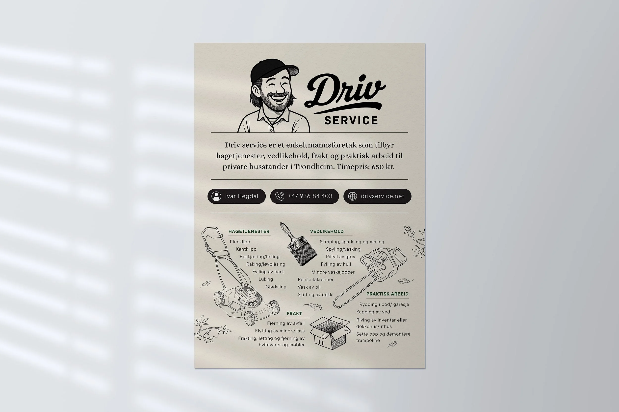 Driv service er et enkeltmannsforetak som tilbyr hagetjenester, vedlikehold, frakt og praktisk arbeid til private husstander i Trondheim. Foretaket eies av Ivar Hegdal.